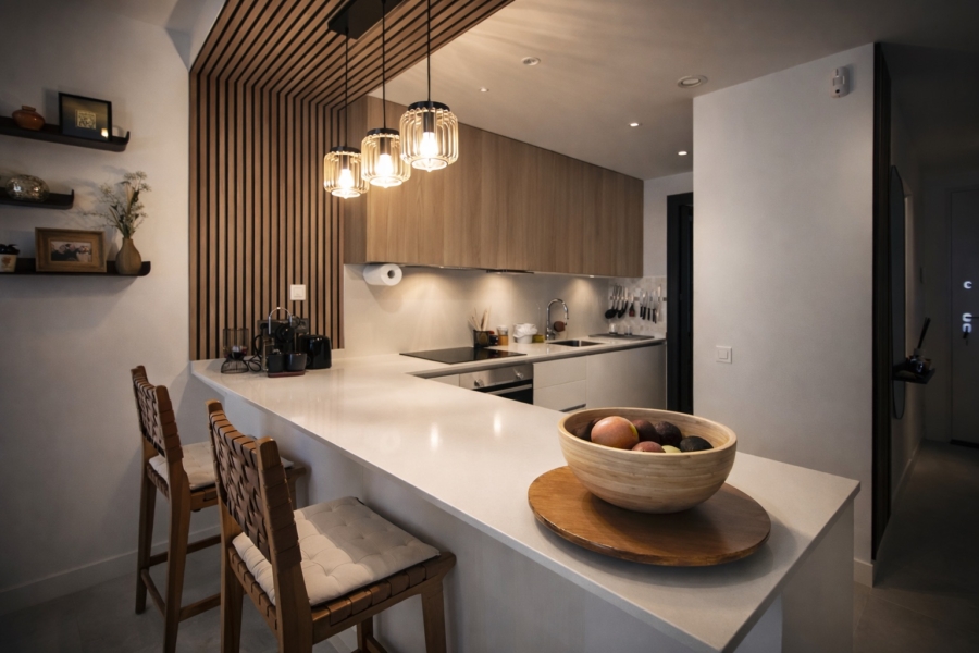 La cuisine entièrement équipée allie fonctionnalité et style, tandis que les deux chambres confortables et les deux salles de bains modernes offrent intimité et détente totale. Chaque détail est pensé pour transformer votre séjour en une expérience sans compromis.