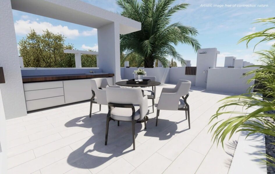 Les extérieurs de ces maisons indépendantes sont conçus pour maximiser le plaisir du climat méditerranéen. Chaque propriété dispose d’une piscine privée, idéale pour se rafraîchir pendant les chaudes journées d’été. De plus, le solarium offre un espace parfait pour bronzer ou profiter des vues panoramiques. La présence d’un jacuzzi ajoute une touche de luxe, permettant des moments de détente en plein air. Les terrasses spacieuses sont idéales pour des dîners en plein air ou simplement pour profiter de la tranquillité de l’environnement.