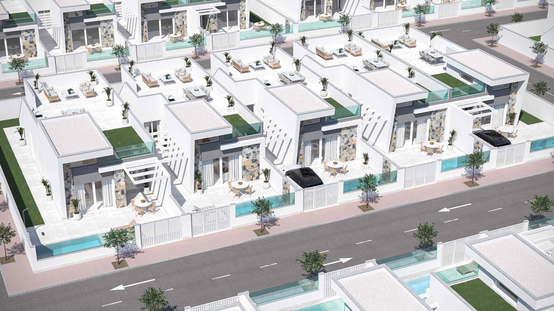 L’intérieur des villas est équipé de fenêtres en aluminium et d’armoires encastrées. Chaque maison dispose d’une cuisine entièrement équipée avec des appareils électroménagers, un éclairage intérieur LED et une pré-installation pour la climatisation. Les salles de bains sont finies avec des matériaux de haute qualité et la maison comprend une pompe à chaleur aérothermique pour une utilisation efficace de l’énergie.