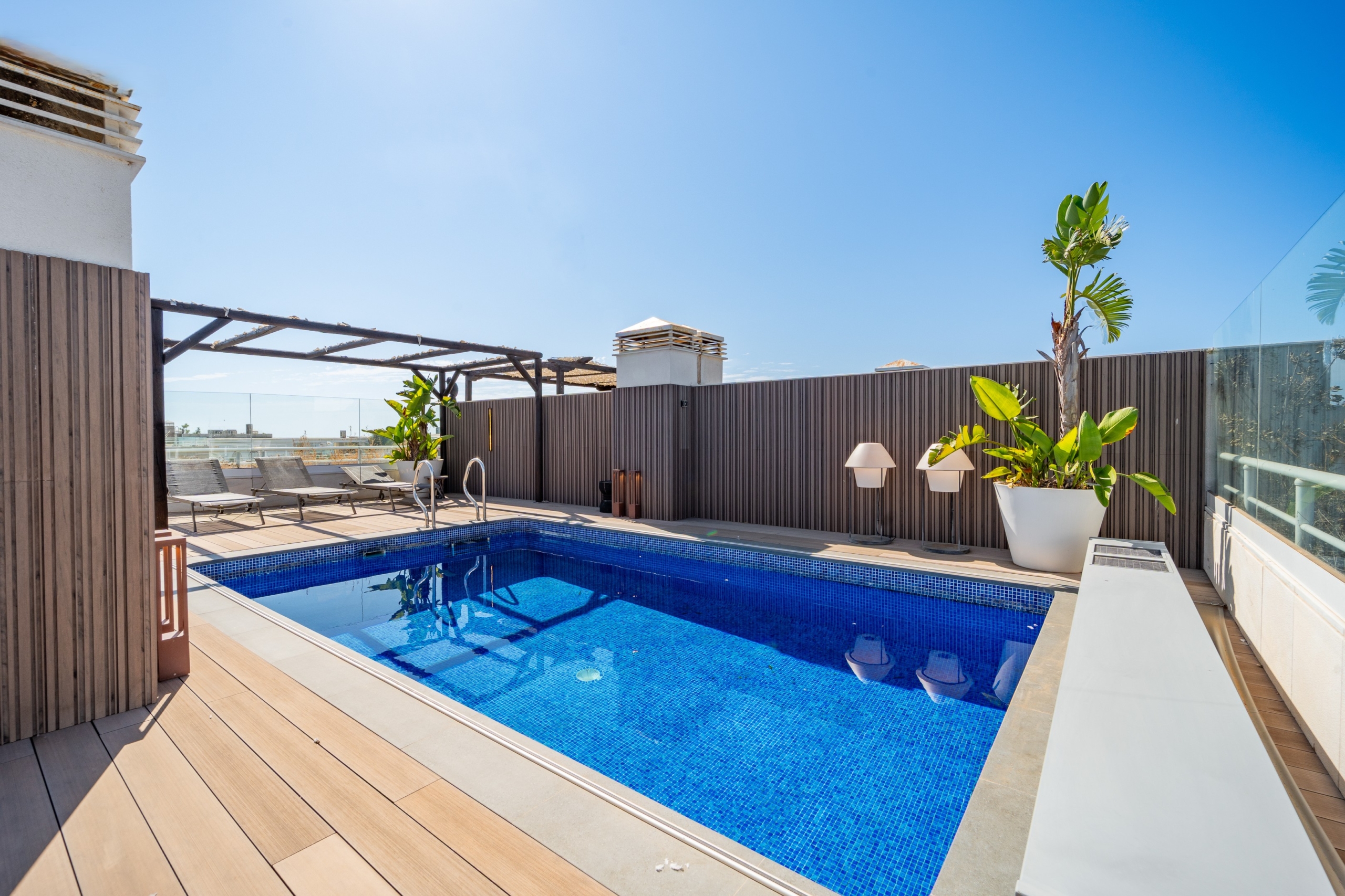 Le niveau supérieur du penthouse dispose d’une terrasse exceptionnelle de 300 m² conçue pour le divertissement et la détente. Ce niveau comprend un salon entièrement clos et climatisé, un salon extérieur couvert supplémentaire et un coin repas à la décoration d’inspiration africaine, une deuxième cuisine et une salle de bains complète. Au sommet, le solarium privé et la piscine chauffée offrent une vue à presque 360º sur le littoral et ses environs.