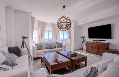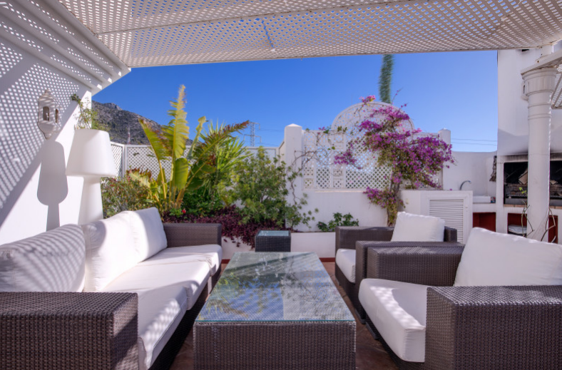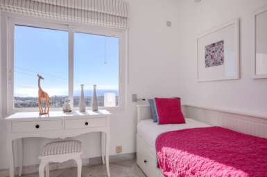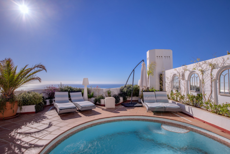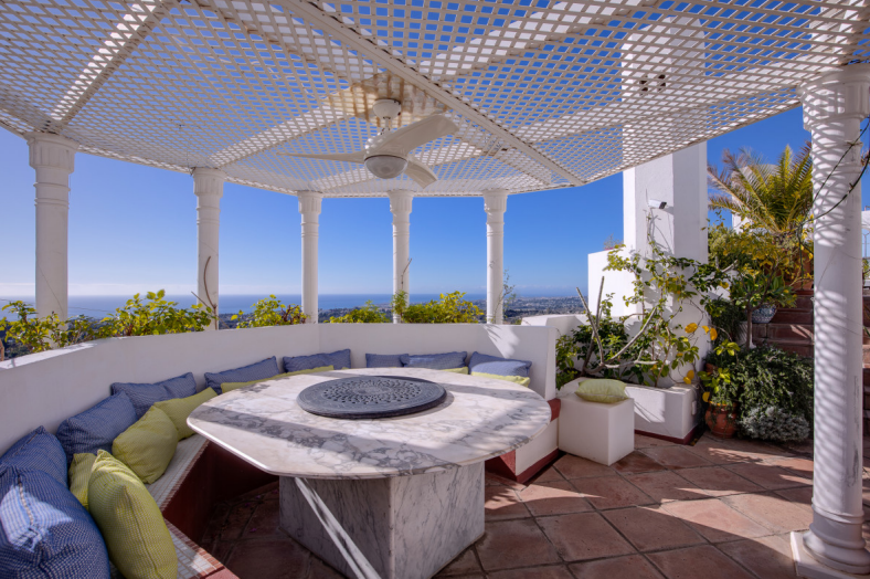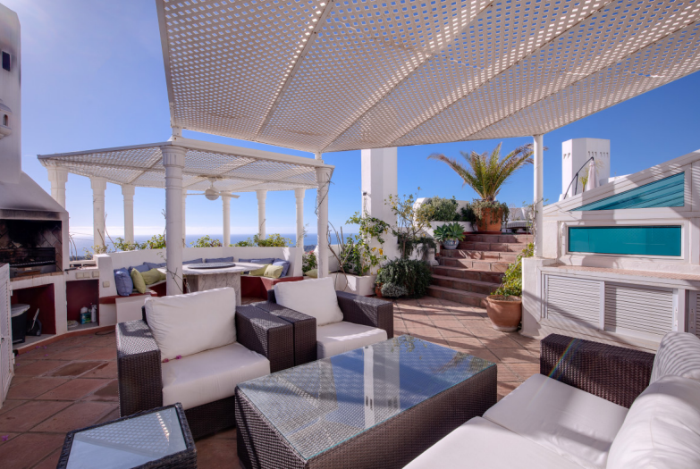 La terrasse du niveau supérieur, d’une superficie de 190 m2, offre un vaste espace pour se délecter de la beauté panoramique de la Costa del Sol. Ce havre de paix extérieur comprend une grande terrasse partiellement couverte dotée d’une piscine privée, d’une douche et d’un barbecue, créant ainsi un cadre parfait pour les réceptions en plein air. De plus, la terrasse donne accès à une quatrième chambre séparée avec salle de bains, située à ce niveau. En complément, un garage privé de 28m2.