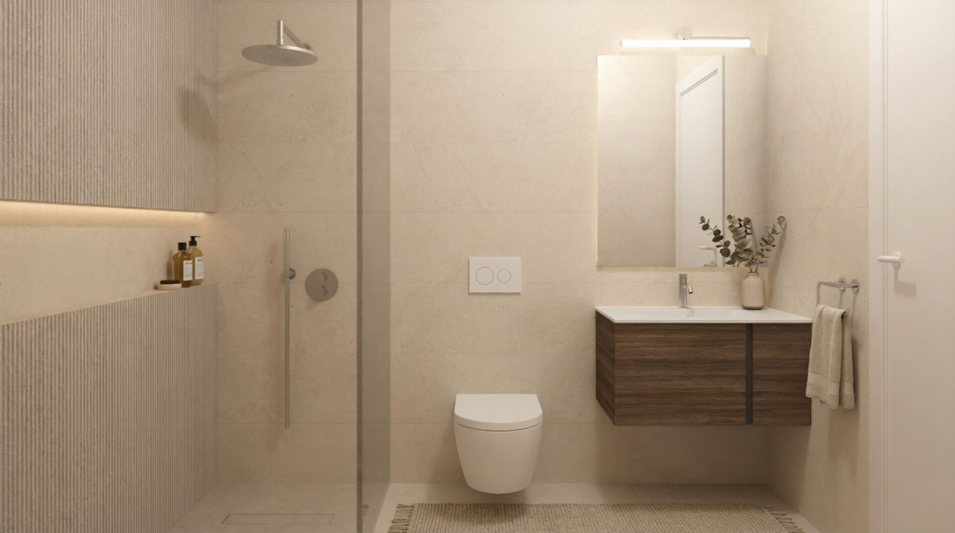 L’intérieur de ces maisons indépendantes est conçu avec un accent sur le confort et la modernité. Avec deux chambres et deux salles de bains, chaque maison offre un espace bien réparti pour la vie quotidienne. Les sols en grès cérame apportent une touche de sophistication et sont faciles à entretenir. Les maisons sont équipées de la climatisation et d’une pré-installation pour un système supplémentaire, assurant un environnement agréable toute l’année. Les volets roulants électriques et l’interphone vidéo ajoutent un niveau supplémentaire de confort et de sécurité. La cuisine est équipée d’appareils modernes, et les placards intégrés dans les chambres optimisent l’espace de rangement.