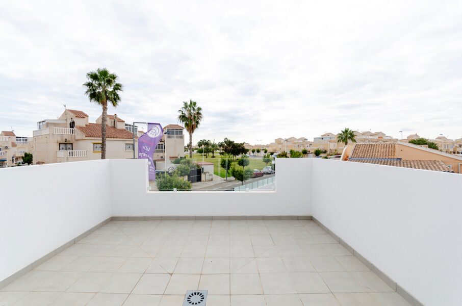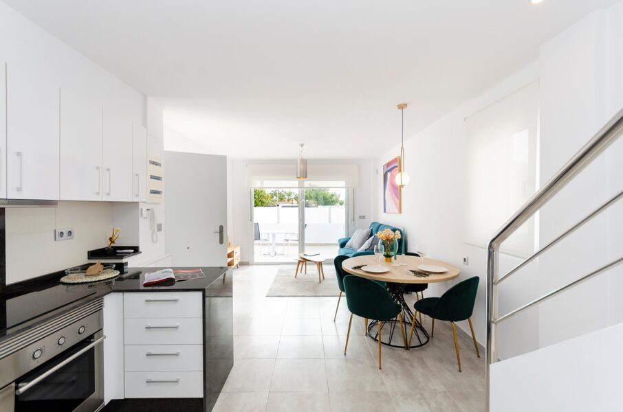 Les extérieurs de ces maisons mitoyennes à Torrevieja sont conçus pour maximiser le plaisir du climat méditerranéen. Chaque logement dispose d’une terrasse privée, parfaite pour se détendre en plein air ou profiter de repas en famille. De plus, il est possible d’inclure un solarium, idéal pour ceux qui souhaitent un espace supplémentaire pour bronzer ou créer une zone de détente personnalisée. La présence d’une piscine privée dans chaque maison mitoyenne ajoute une touche de luxe et d’exclusivité, permettant de se rafraîchir lors des journées les plus chaudes sans quitter la maison. Les volets roulants électriques installés sur les fenêtres extérieures offrent confort et sécurité, permettant de régler facilement l’entrée de la lumière.